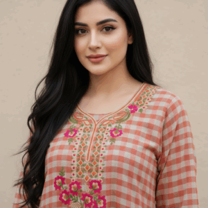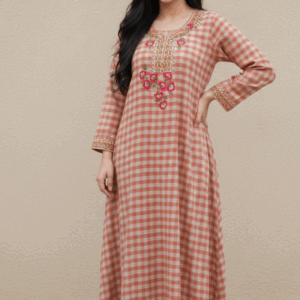 ✨ وصف المنتج اخطُ بخطوات الأناقة مع جلابية القماش القطني (Gingham) المطرزة يدوياً الخاصة بنا. تجمع هذه القطعة بجمالية آسرة