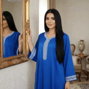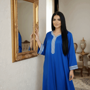 تتميز هذه القطعة بتصميمها المصنوع ببراعة بلون أزرق ملكي مذهل ونابض بالحياة، يجمع بين الجرأة والرقي. صُنعت العباية من قماش