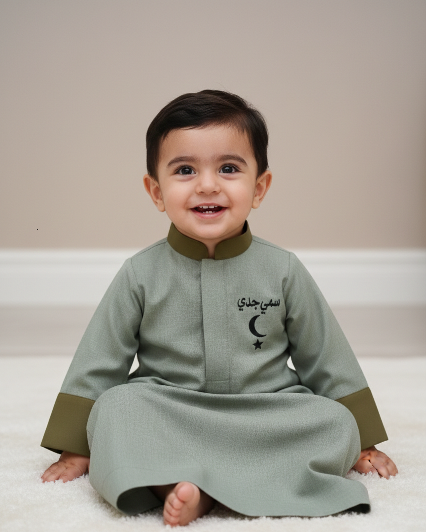 تفاصيل عاطفية: تطريز أسود أنيق بعبارة “سمي جدي”، يزينه شعار الهلال والنجمة الكلاسيكي بلمسة تراثية.