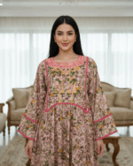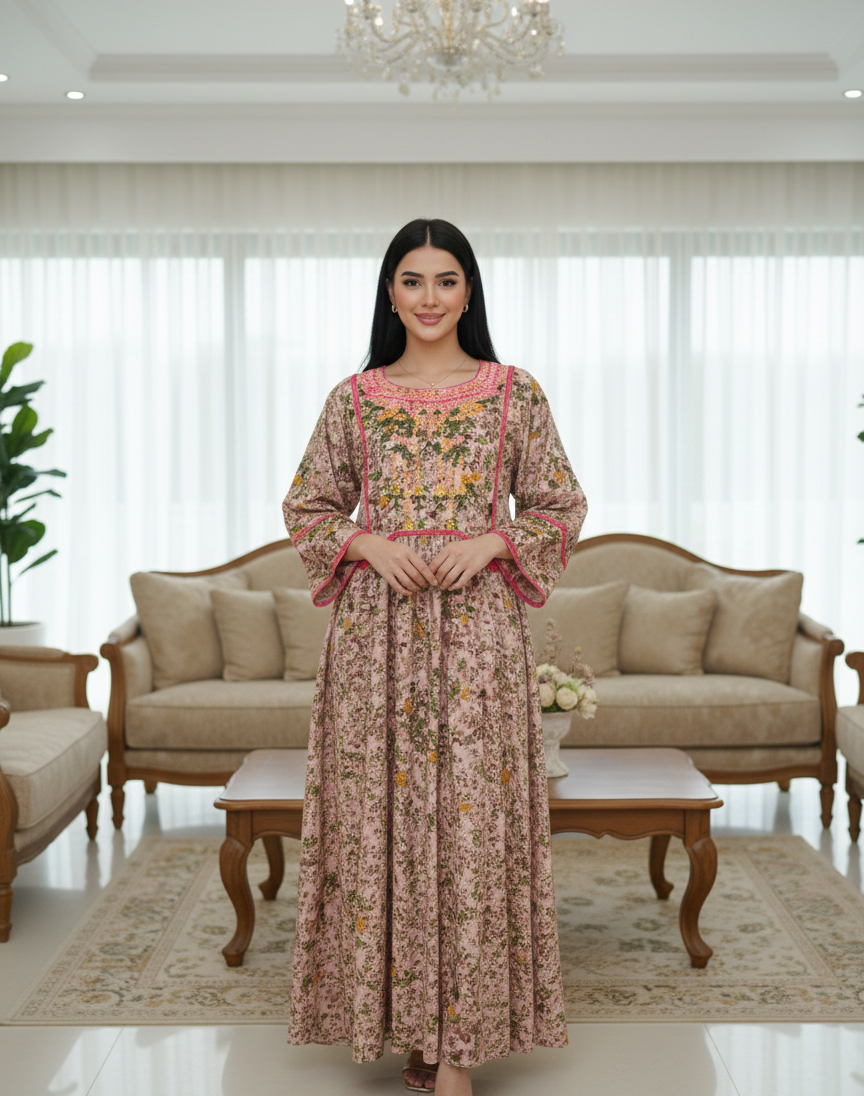 تتميز الجلابية بلمسات جمالية رائعة من التطريز الدائري المتقن على خط العنق، وذلك باستخدام خيوط وردية، وصفراء، وخضراء لمنحها مظهراً كلاسيكياً وتقليدياً. هذا التطريز هو السمة التصميمية الرئيسية في منطقة الصدر من الفستان. يحيط شريطة (Piping) باللون الوردي الفوشيا بياقة التطريز، وخط الخصر الإمبراطوري، وحواف الأكمام الواسعة، مما يضيف تحديداً و لمسة لونية مبهجة.