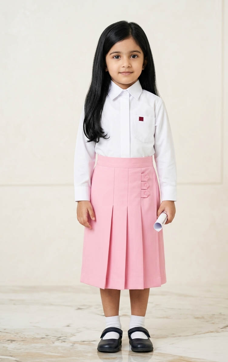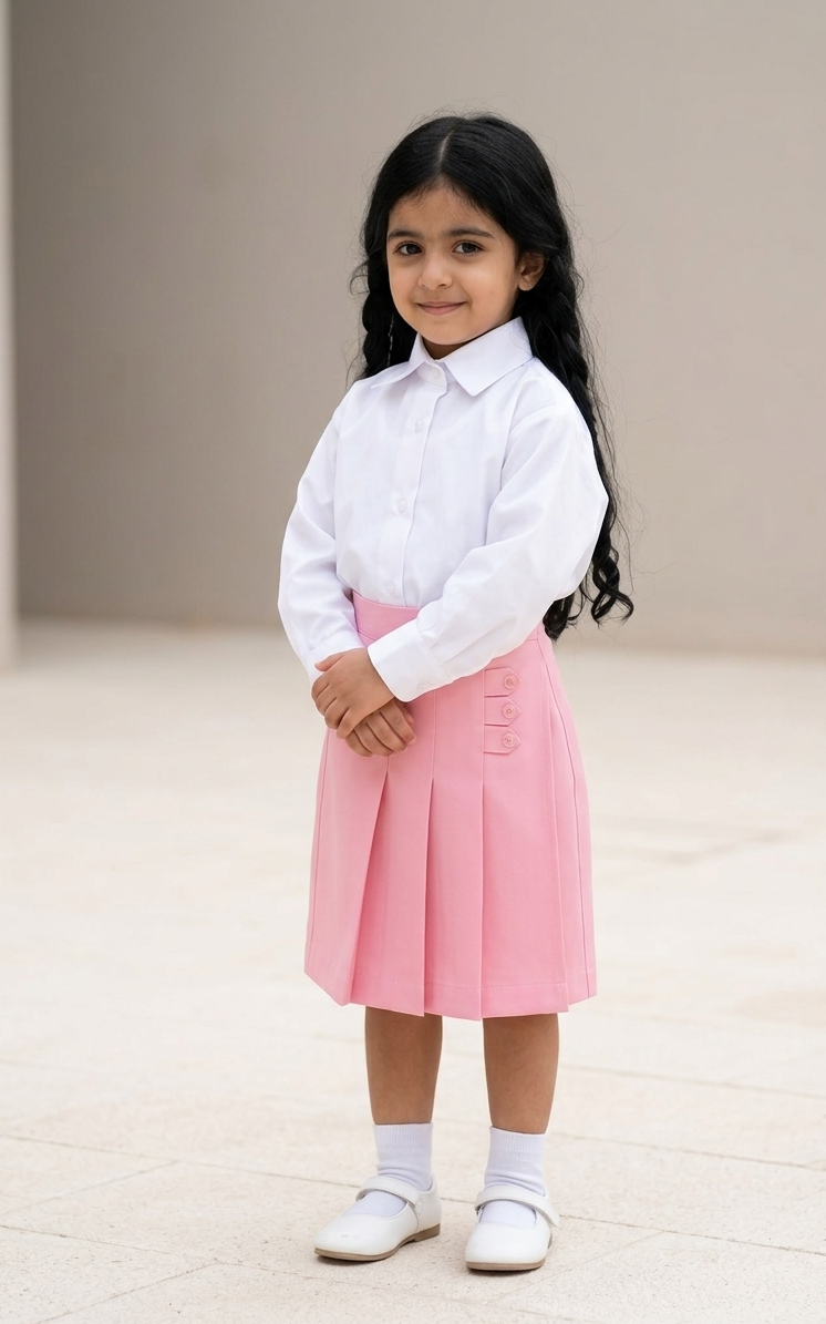 لمسات عملية وأنيقة: تتميز التنورة الوردية بتفاصيل أزرار جانبية مزخرفة، منسقة مع قميص أبيض ناصع بأكمام طويلة وأزرار أمامية، لمنح طفلتك مظهراً كلاسيكياً لا يغيب عن الموضة.