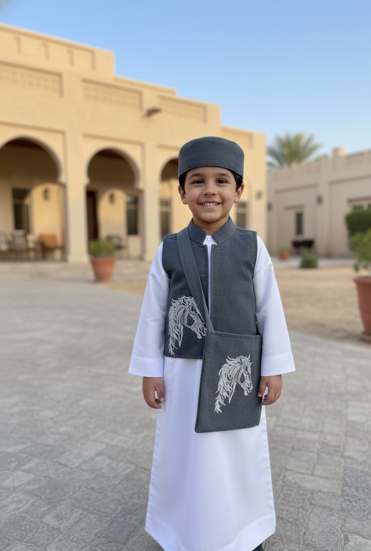 سديري مطرز: سديري بتصميم عصري وأنيق باللون الرمادي الفحمي. يتميز بتطريز دقيق ورائع لرأس الخيل على الظهر، مع لمسة مطابقة من الأمام تضفي فخامة استثنائية.