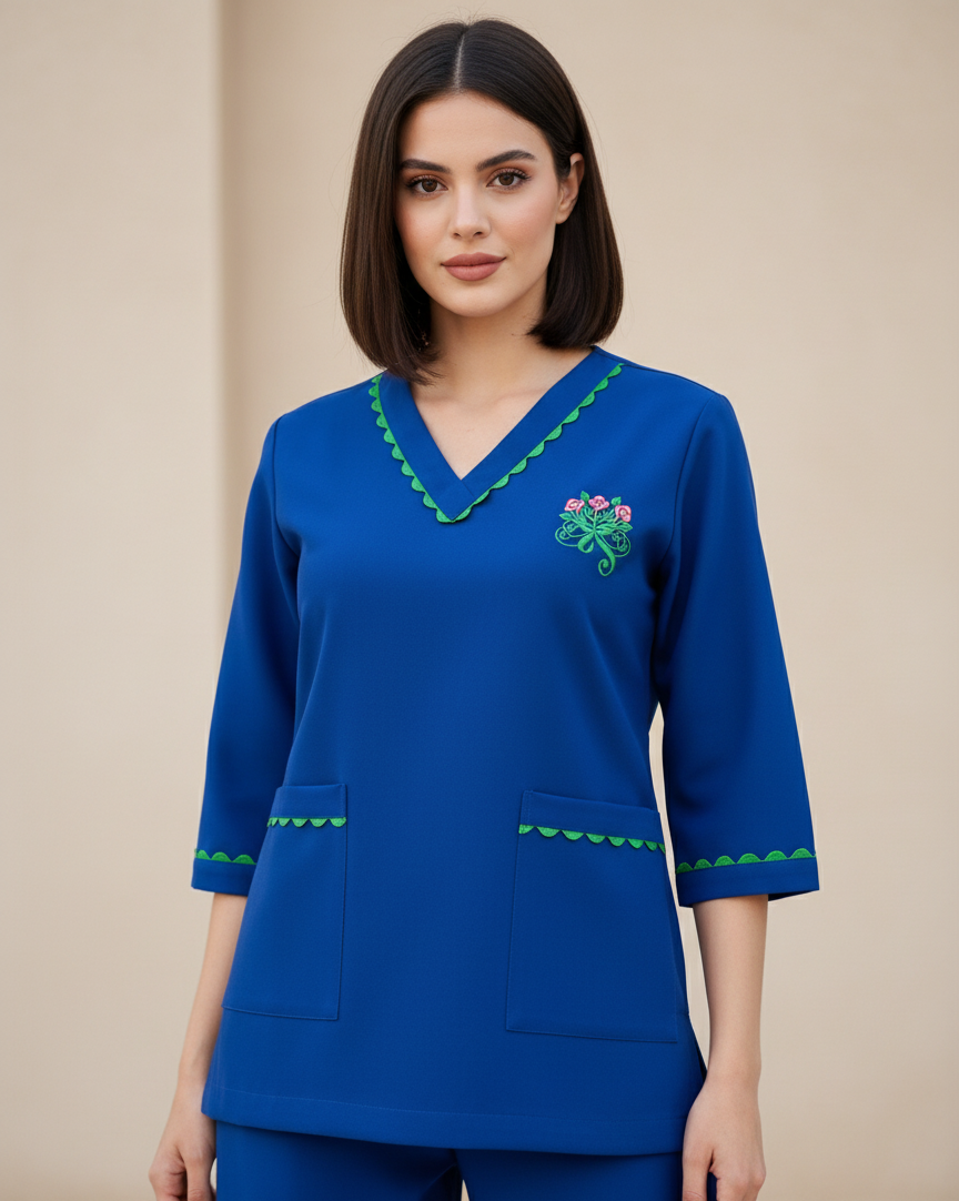 طقم موحد (يونيفورم) مكون من قطعتين، صُمم بعناية من قماش الكريب الفاخر ليمنحكِ مظهراً مطفياً (Matte) غاية في الرقيّ، مع ثنيات “انسيابية” تتحرك بمرونة مع الجسم. هذا الطقم مخصص لمن يمثلون الوجه الواجهي للمنازل الراقية أو المتاجر الفاخرة (البوتيك)، حيث يضمن لكِ مظهراً أنيقاً وخالياً من التجاعيد من بداية الدوام وحتى نهايته.