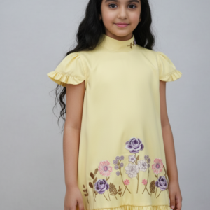 تفاصيل التصميم قصّة كلاسيكية: يتميز الفستان بصدرية منظمة بأزرار مع ياقة مدببة تقليدية وأكمام “كاب” منفوخة ورقيقة، لمنح طفلتكِ إطلالة