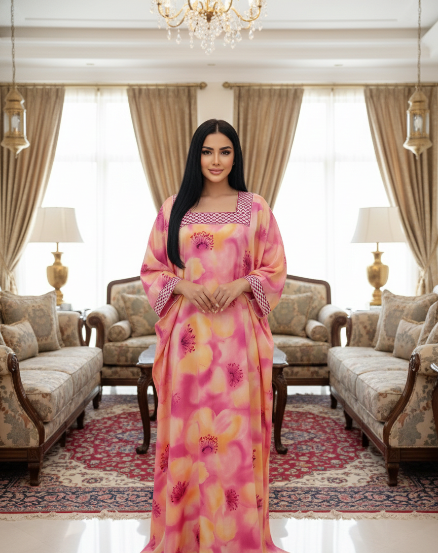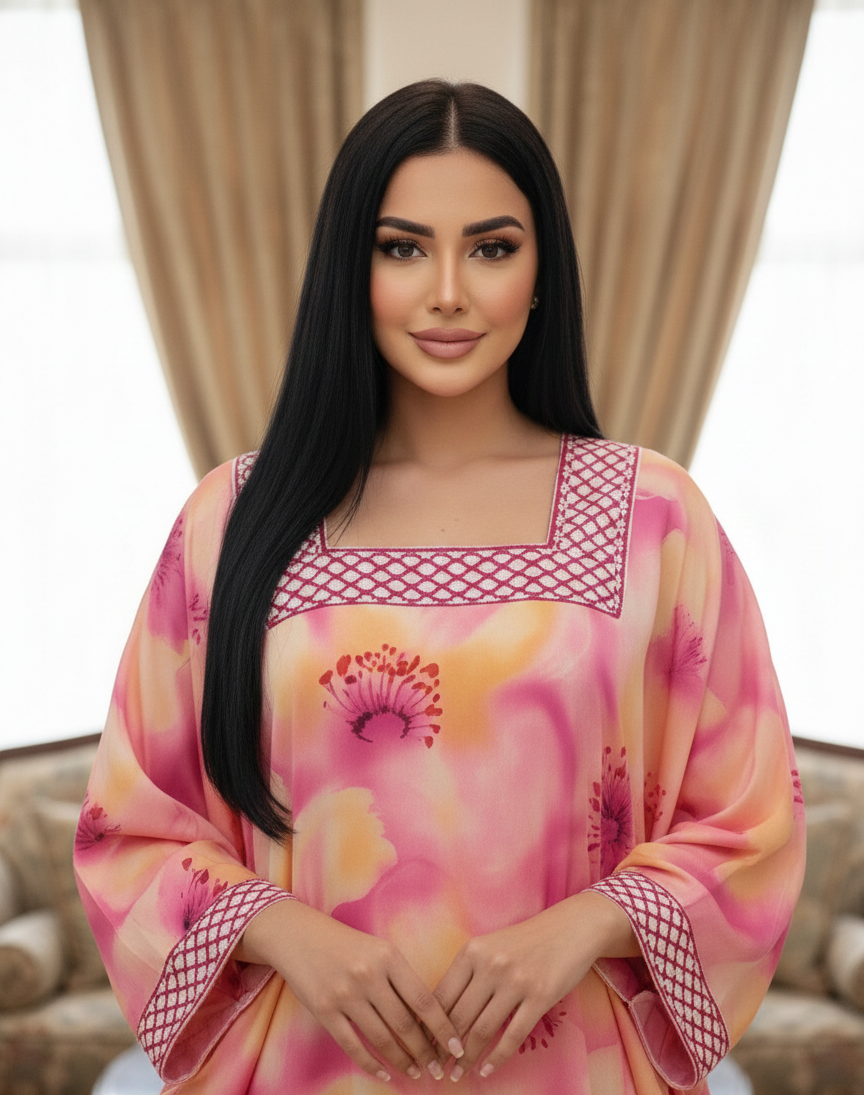 نعمي بقمة الرقي والراحة مع هذه الجلابية المائية (Watercolor Jalabiya) الأخاذة، التي تتميز بمزيج حالم من الألوان الدافئة المستوحاة من غروب الشمس الآسر. إنها القطعة المثالية اللافتة للنظر للارتداء المريح الفاخر (Elevated Lounging)، أو كملابس للمنتجعات (Resort Wear)، أو للمناسبات النهارية الراقية.