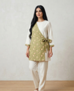 الجزء العلوي (البلوزة): تونيك بفتحة رقبة على شكل حرف V وتصميم مُحدد، يتميز بأكمام بطول 3/4 مع أساور كحلية متباينة.