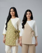 أبرز مميزات المنتج تصميم عصري وراقي: يتميز بقاعدة بلون “الجمل” (Camel) الفاخر، مع صدرية مكسرة (Pleated) باللون الأبيض المتباين، وياقة